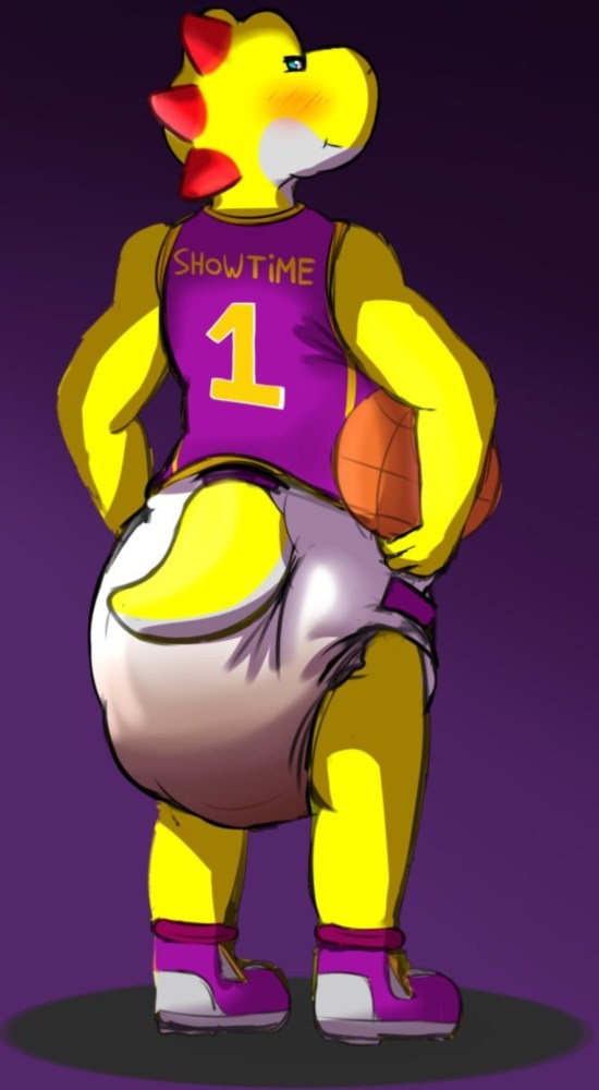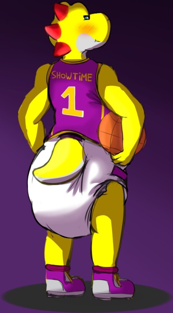 Showtime with his back against the viewer, wearing his jersey and diaper.