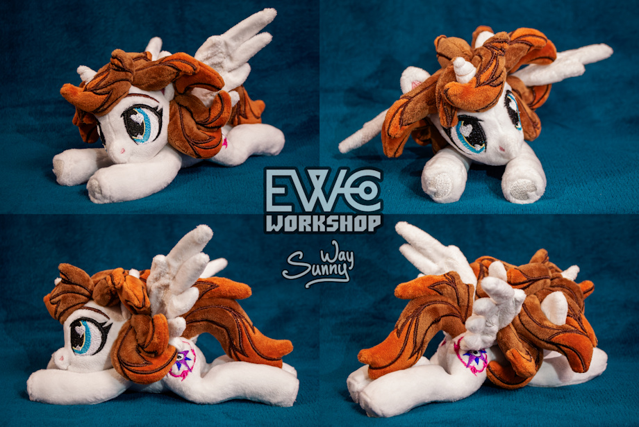 I’ve finished a really cool fluffy and messy plushie! So many details were embroidered - eyes, nose, ears, horn, all 4 hooves, cutie mark, wings on both sides, the whole mane and tail! The wings have metal frame inside, so they can move. And there’s even a squeaker inside - this plush squeaks! ^^ Maybe I overdid something here and there, but it’s all good experience!