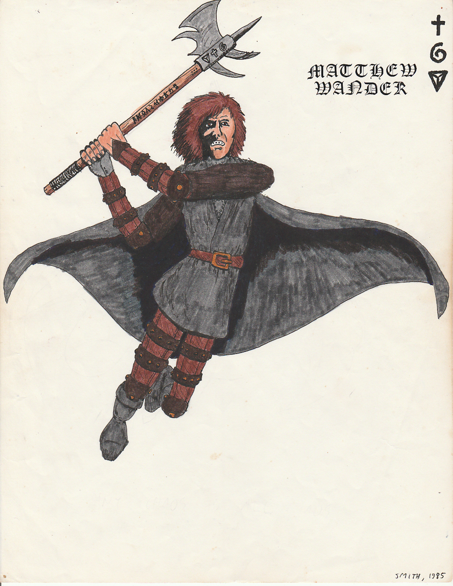 Matthew Wander was my brother Matt's character in my Runequest campaign. A landless noble, Wander was a member of the cult of Storm Bull, the god of berserkers, whose worshippers are renowned for their fury in battle. The cult's Runes are Death, Air/Storm, and Beast, and its goal is the destruction of Chaos, the corruption that infests the world of Glorantha. Storm Bull's hatred of Chaos is absolute and uncompromising. His worshippers' motto is "Any Chaos is all Chaos." Wander eventually became a Rune Lord-Priest of Storm Bull, a mighty warrior who could also cast powerful Rune magic.