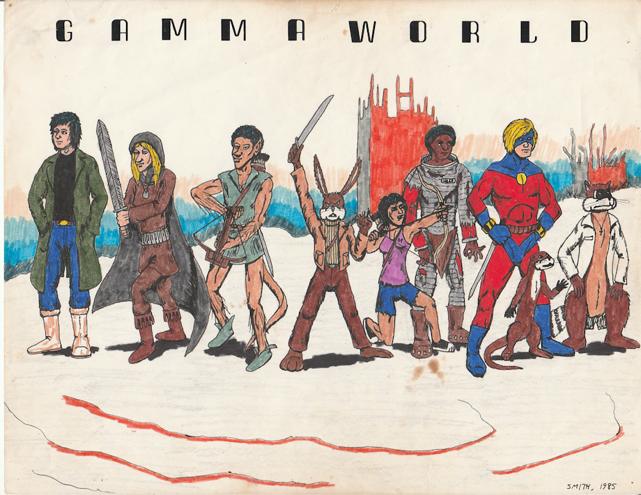 This is the second group portrait I did for our Gamma World game, a post-apocalyptic science fiction RPG, as the first one was kind of rough. You'll recognize some of the characters from my previous GW pics, including Zorba, a pure-strain human warrior; Barnabus, a spine-throwing mutant human; Benjamin Rake (formerly Oswald), a mutant rabbit who could fire beams of deadly radiation from his eyes; Leech, a mutant human with the dreaded life leech power; Captain Marbel, a mutant human who could fly and fire heat blasts and modeled himself on a character he saw in a pre-apocalypse comic book; and Ollky Surfis, a mutant otter with gills who could absorb and release electricity. To this we add Michael Saige (the guy in the green coat), a mutant human with telepathic powers who was inspired by the song "Veteran of the Psychic Wars" by Blue Oyster Cult; Hypatia (the girl with the bow beside Benjamin), a pure-strain human warrior; and Degas Ryk, a member of a mutant raccoon species called dabbers who possessed telepathy, telekinesis, forcefields, and illusion powers.