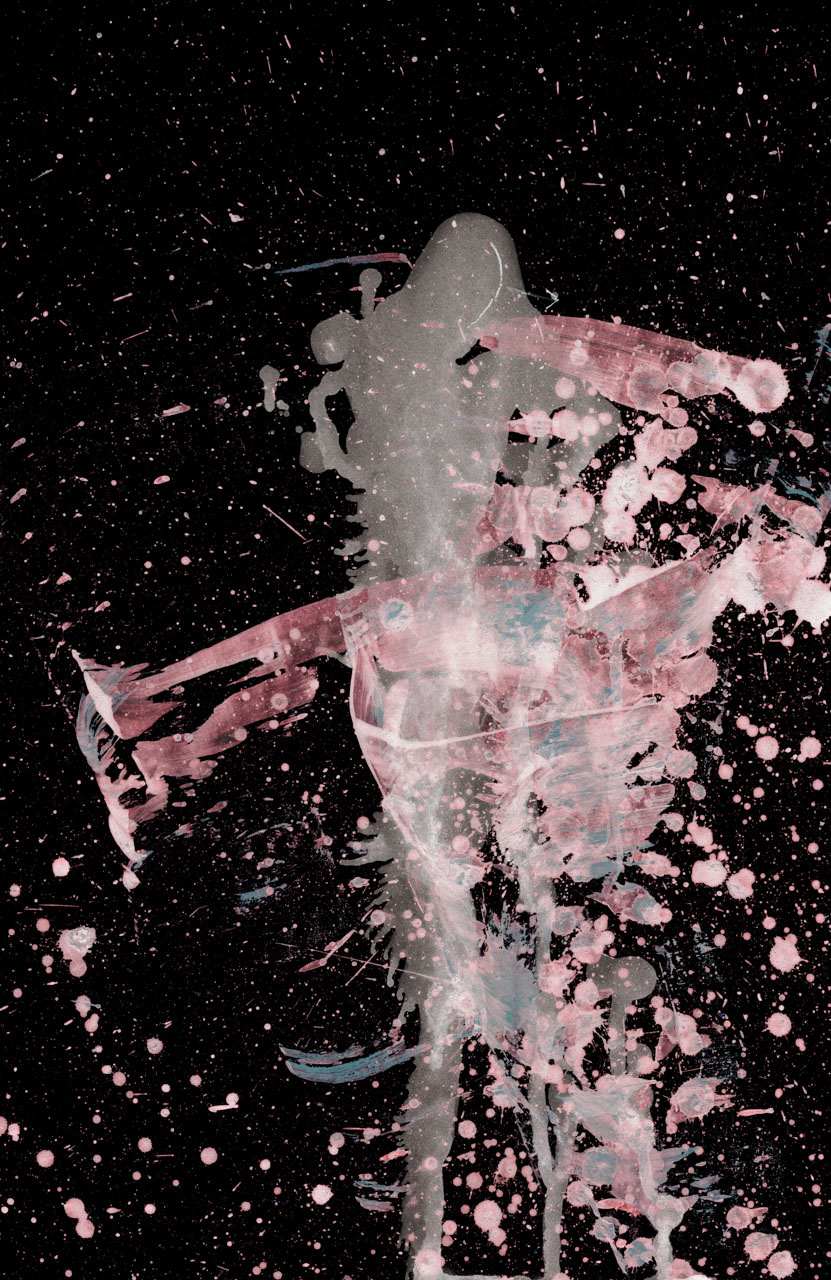 Scheduler can't alt-text some sites, so alt: Abstract mixed media inversion figure/face studies, often non-human. Rich colors on black, with a strong tendency towards pink spatters.