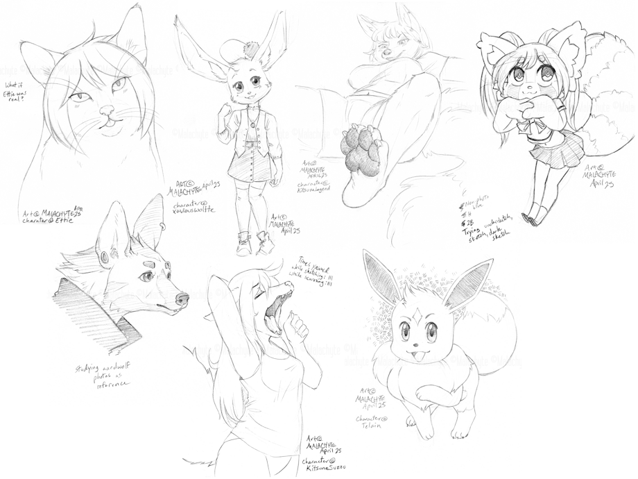 My sketches for the Ko-Fi supporter rewards for April, with the theme of... none! I just did whatever felt right for each person's character here, setting a timer for 15 minutes per sketch.