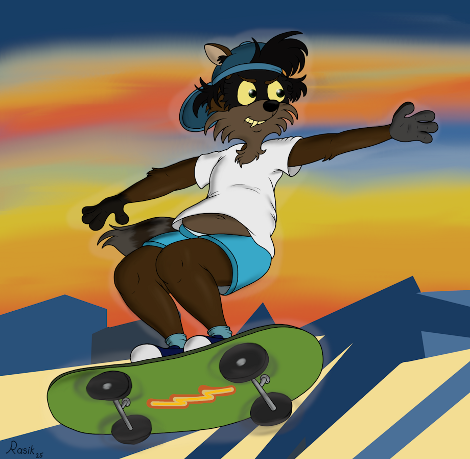 I have made already drawings with this young antiraccoon boy as skater. Here he is in his shorts and shirt fearlessly skating.