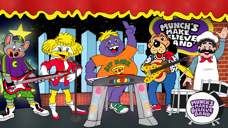 Chuck E. Cheese: playing with his electric guitar and singing Helen Henny: singing with her microphone Mr. Munch: playing with his keyboard and singing Jasper T. Jowls: playing with his bass guitar and singing Pasqually the Chef: playing with his drums and singing