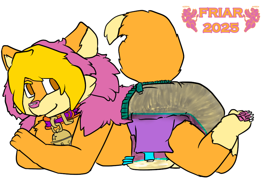 Illustration of Friar the wet and messy transformed diapered fox wearing his bell collar and flopped on his tummy in front of a fox themed jack o lantern and a barn.