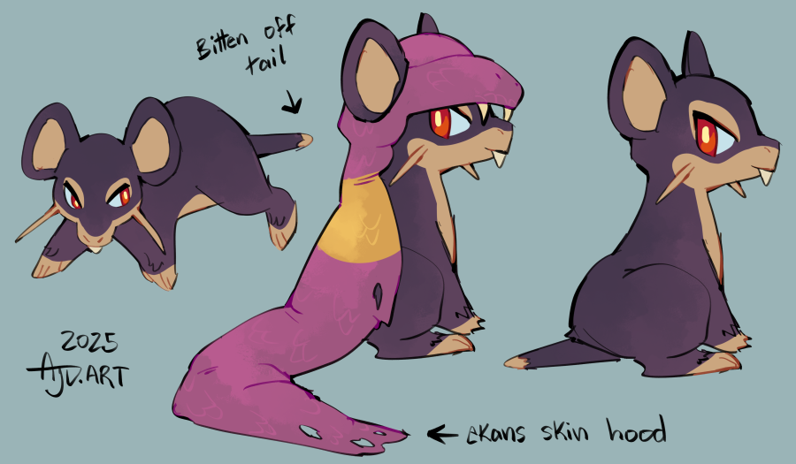 Another personal oc idea I had! Sharp the rattata lost his tail on his first outing of the nest. As he grows and levels up, he keeps a treasured snake skin from one of his first dungeon victories. It's a great way to hide his damaged tail.