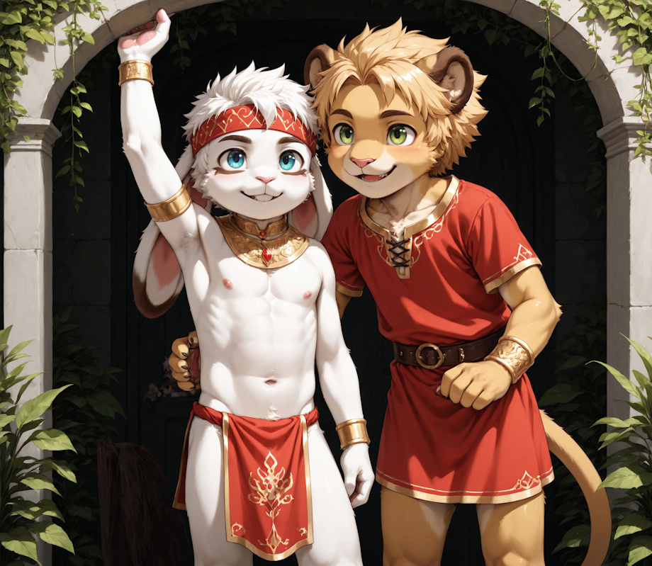 As Flavius passed through the grand gates of the main palace, his eyes caught a figure waiting at the top of the stairs — a young rabbit, his fur pure white, his eyes light blue, wearing gold-trimmed cloth that glowed softly in the sun.