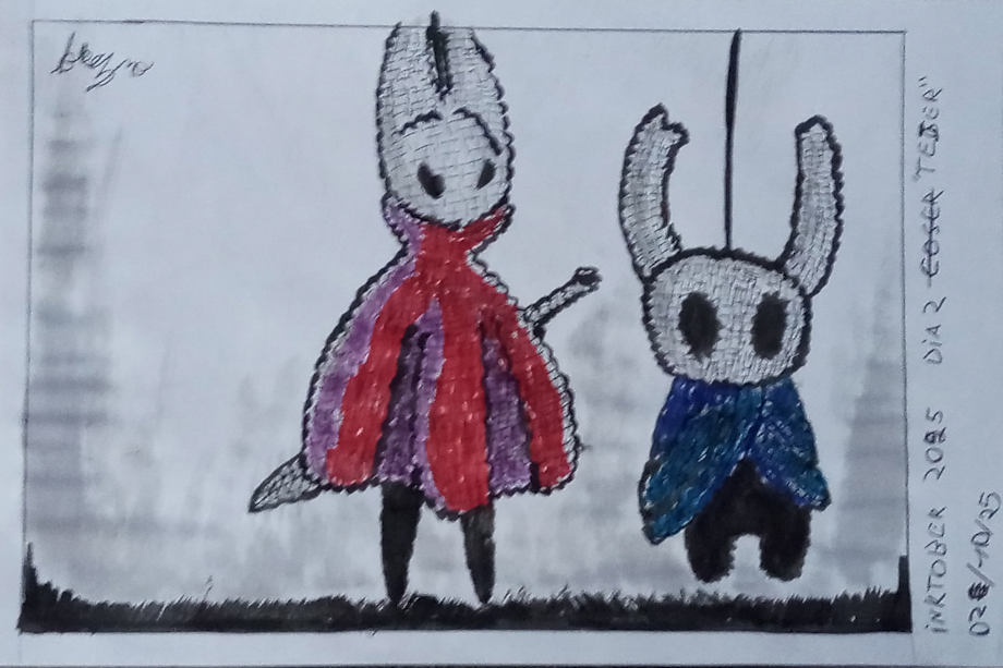 literalmente puse los detalles finales a ultimo minuto, pero lo termine a tiempo XD, la palabra del segundo día es “Tejer”, se me ocurrió dibujar dos muñecos tejidos de los dos personajes más conocidos de “Hollow Knight” y “Silksong”, el Hollow Knight y Hornet.