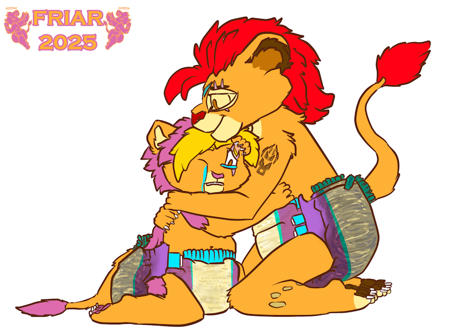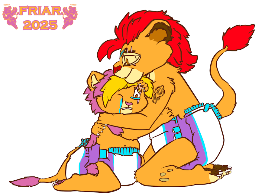 Illustration of Friar the wet and messy diapered lion snuggling Kion the wet and messy diapered lion in tears, holding a scar over one of his eyes. Kion is also sporting the same healed scar, kneeling down to comfort Friar in front of the Tree of Life, where he is also The Lion King.