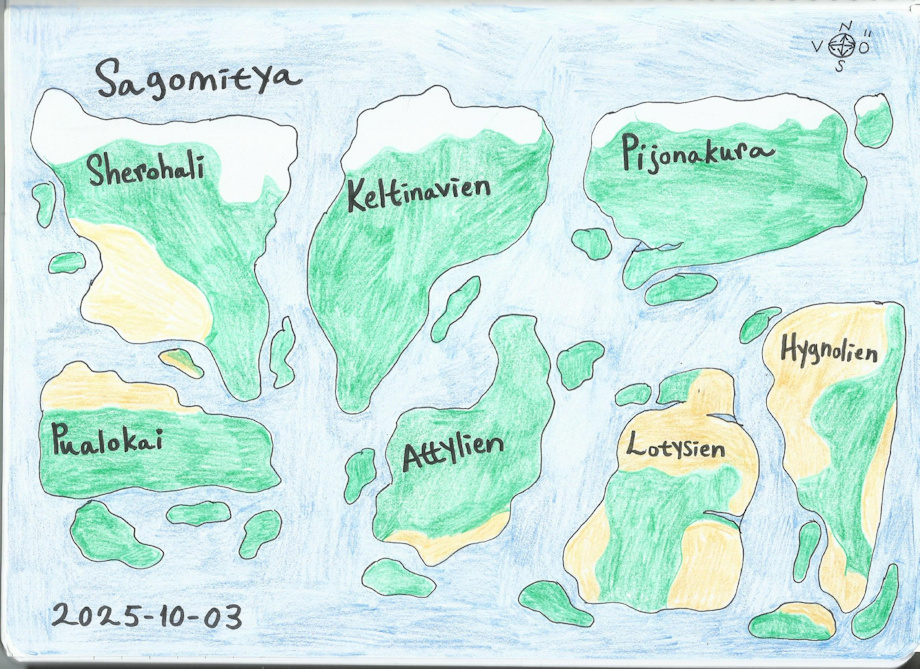 Here is the coloured version of the map of Sagomithya. Such a shame I didnt bring the map of Earth to reference the colouring to give the nations deserts, forests, mountains and snowy icy mountains. Good thing I scanned the linearted version before colouring it in case I attempt to colour the map again. https://inkbunny.net/s/3703999