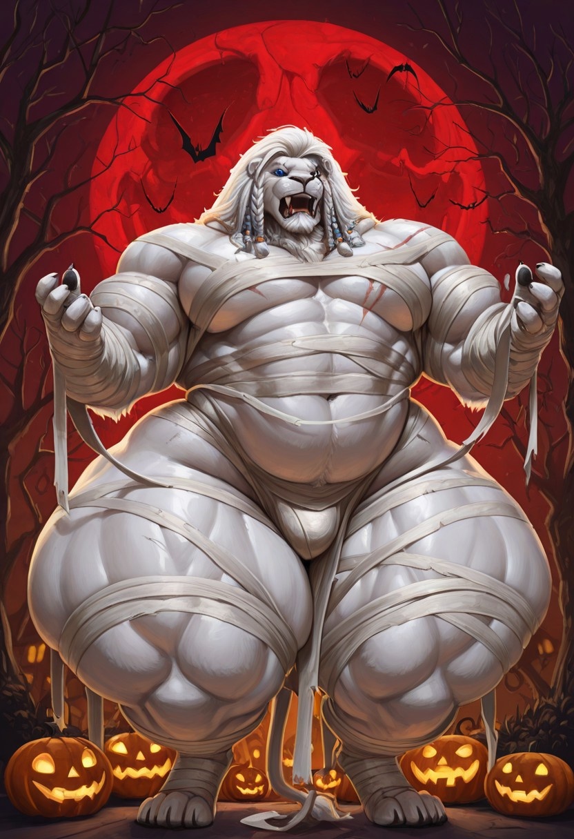 masterpiece, best quality, AGoldmane, furry male, solo, muscular, lion, white fur, white hair, braids, blue eye, glowing red eye, eye scar, fangs, male, halloween theme, jack-o-lantern, solo, mummy costume, ((hyper thick thighs:1.5)), ((hyper wide hips:1.5)),