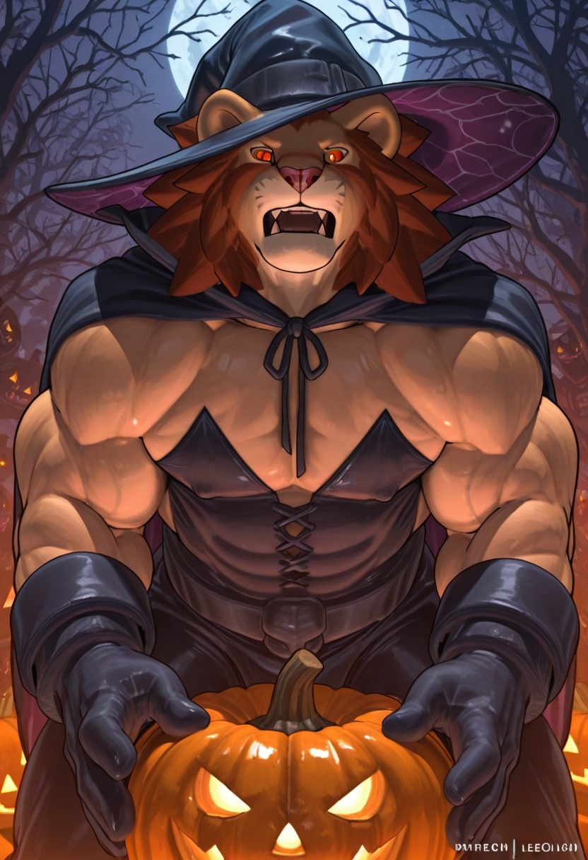 masterpiece, best quality, bara, muscular male, lion boy, leo_lion, male, halloween theme, jack-o-lantern, solo, witch costume