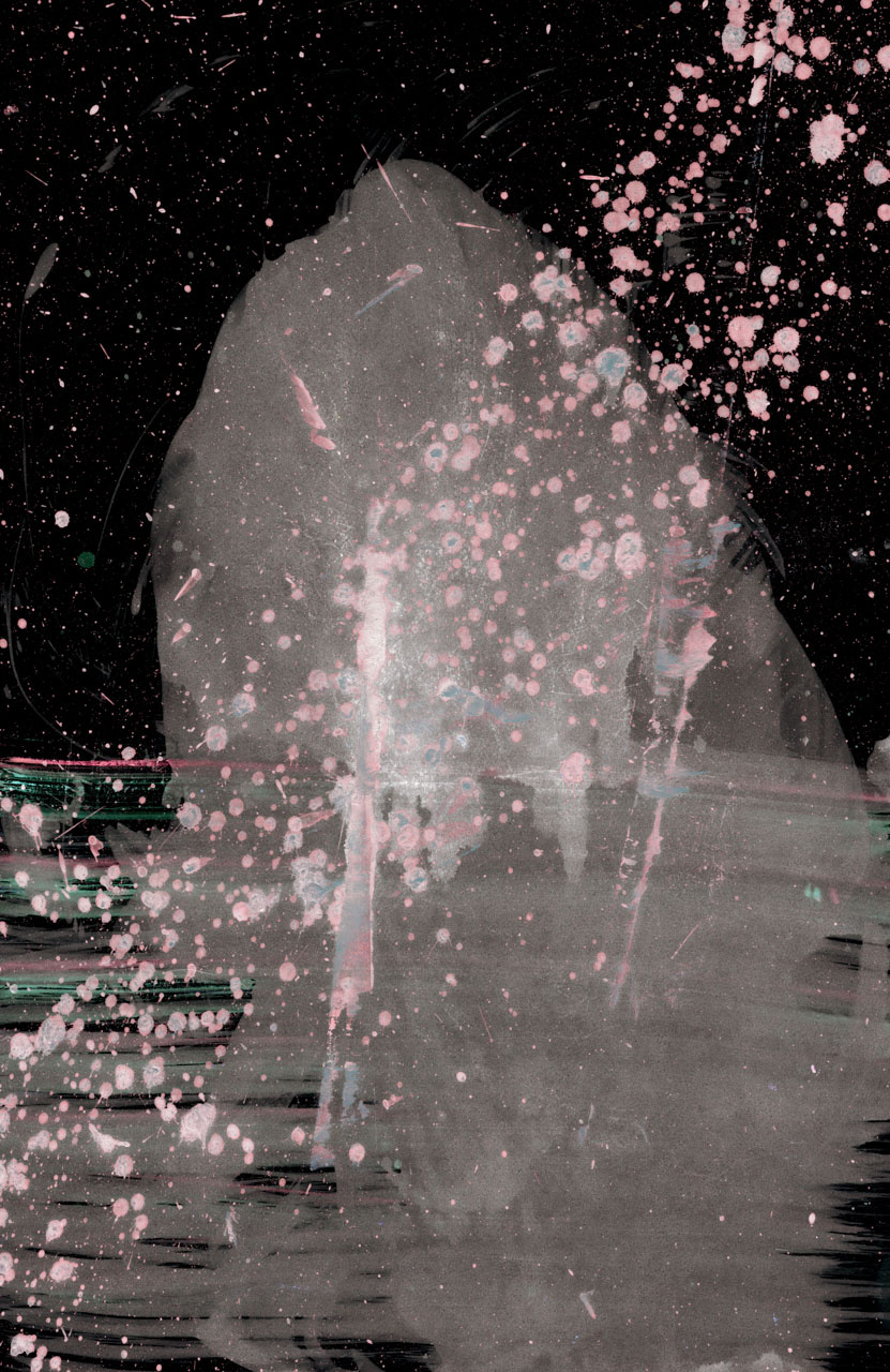 Scheduler can't alt-text some sites, so alt: Abstract mixed media inversion figure/face studies, often non-human. Rich colors on black, with a strong tendency towards pink spatters.