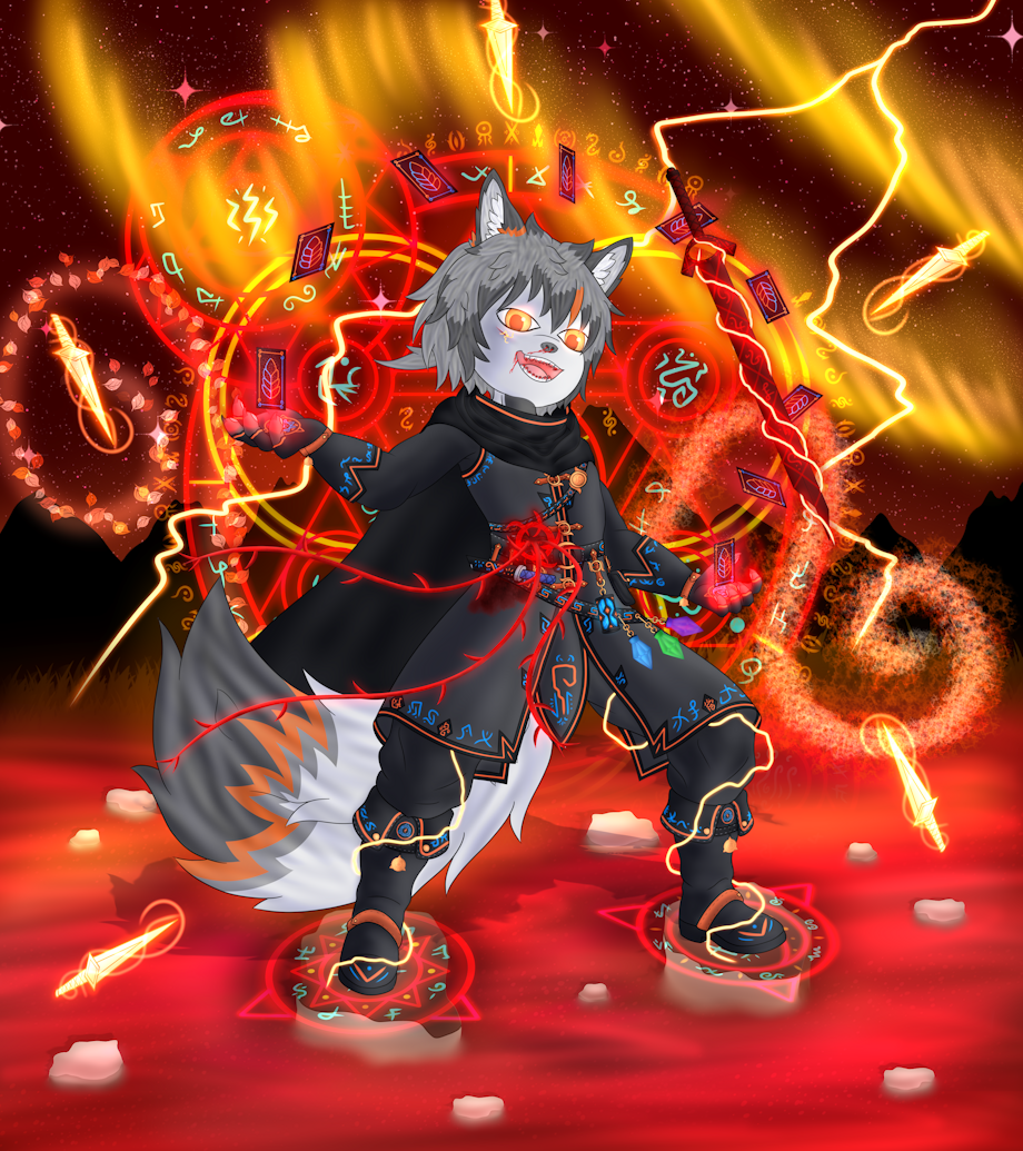 A powerful Psynergic attack of elemental mastery, an ultimate Limit Cast developed by the fledgling Magus Ion under the guidance of Sage Fenrir keying into Ion's uniqueness as a Magus. Using the cards of his spelldeck combined with his natural Æther flow, Ion would combine his Lightning nature with the card power of Fire, Wind, Water and Earth/Gaia along with the essences of Time and Space, the latter of which Ion seamed to have a natural affinity flowing within to create an unrelenting Storm of pure Ætheral expression, the sky would darken into a stary haze as time would stand still, the aurora of the northern boreal would dance across the sky as the elements wound converse down on a single being who's lightning feet could zip across the battlefields would bring in the storming rain, ice and snow, chilled winds the cut through the shattering earth with the flames the burned a deep frostbite and the lightning that deathened the skies, striking down with furious prowess, the storm was said to be like none other and the one at the centre of it all was from then known as the Stormfox