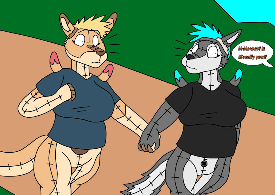 Part 3: The camera turns to face a robotic kangaroo that is decently chubby and seems to be based off of a whoopee cushion for some weird reason that is not explained in this comic. This weird robot roo is a Transformatronic (Transformer that is a FNAF-style animatronic). She does seem to resemble Adrian quite a bit but that may be because they are both a Grey Kangaroo so they share similarities in that case. This unknown roo says "I-I thought I would never see you again... You... You remember me right?" which is odd if this is the first time that Adrian (and by proxy Hilde) has met this whoopee cushion-themed robot roo. Wonder why that is...