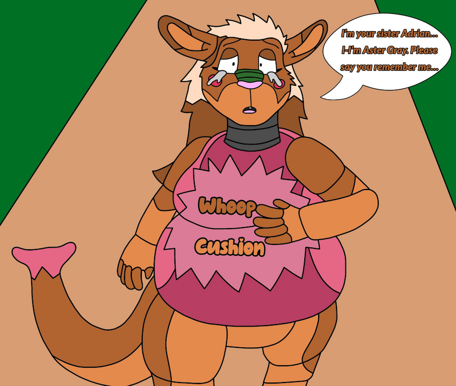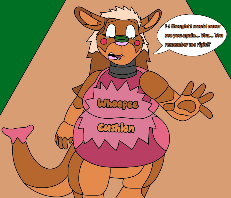 Part 3: The camera turns to face a robotic kangaroo that is decently chubby and seems to be based off of a whoopee cushion for some weird reason that is not explained in this comic. This weird robot roo is a Transformatronic (Transformer that is a FNAF-style animatronic). She does seem to resemble Adrian quite a bit but that may be because they are both a Grey Kangaroo so they share similarities in that case. This unknown roo says "I-I thought I would never see you again... You... You remember me right?" which is odd if this is the first time that Adrian (and by proxy Hilde) has met this whoopee cushion-themed robot roo. Wonder why that is...