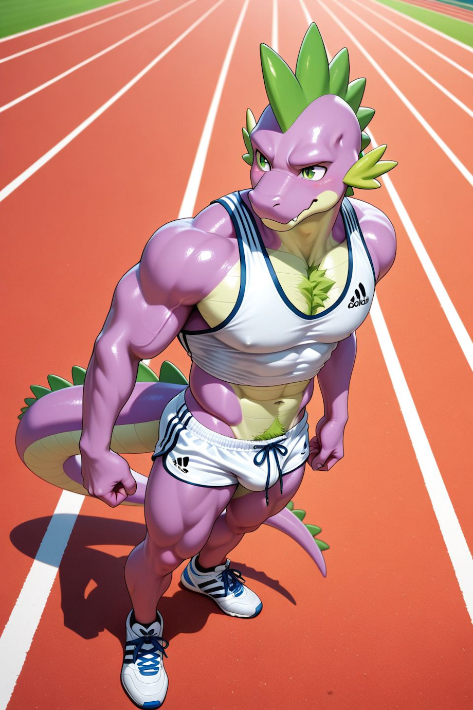 fine details, intricate details, highest quality, perfect anatomy, very aesthetic, best quality, amazing quality, ultra-HD, high resolution, ultra-detailed, absurdres, highly detailed, photorealism, depth of field, detailed , photorealistic details, volumetric lighting, photorealistic, score_9, score_8_up, score_7_up, score_6_up, anthro, male, solo, adirun, Adidas running shorts, running track, loose sleeveless crop top, side split shorts, short shorts, micro shorts, white shorts, wide angle, toned male, full body, standing, muscular male, masculine male, chest hair, pubic hair above shorts, treasure trail hair, Spike The Dragon_(mlp), Green Hair, Green Eyes, Light Purple Skin, Scalie, Furry Anthro Dragon, no horns, no waist_tie_cord