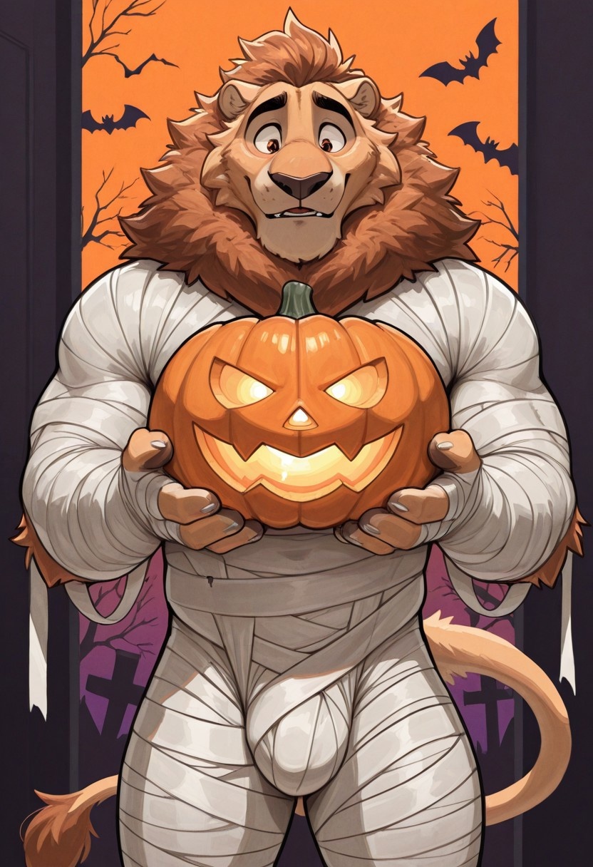 masterpiece, best quality, LeodoreZT, male, anthro, halloween theme, jack-o-lantern, solo, mummy costume