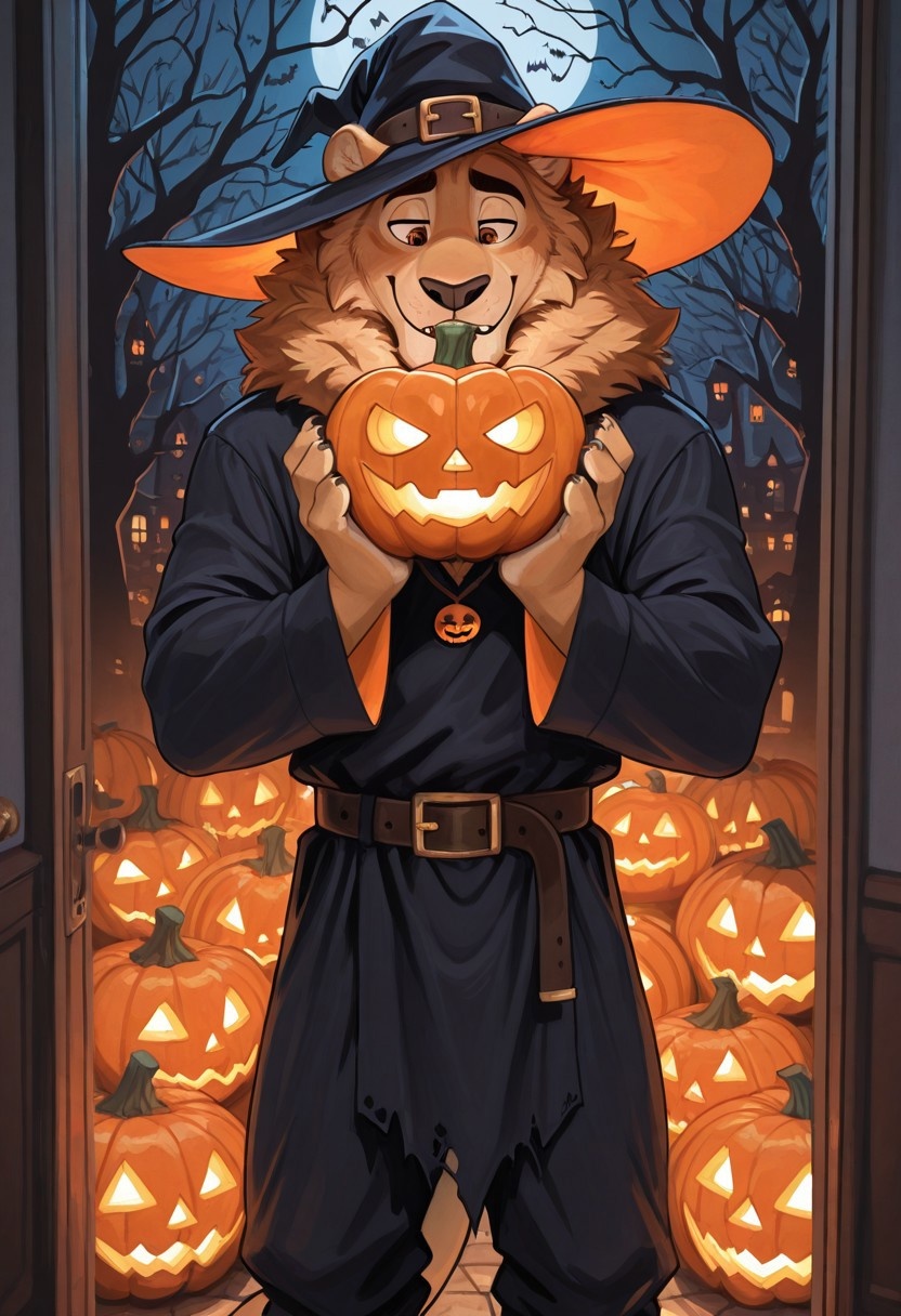 masterpiece, best quality, LeodoreZT, male, anthro, halloween theme, jack-o-lantern, solo, witch costume