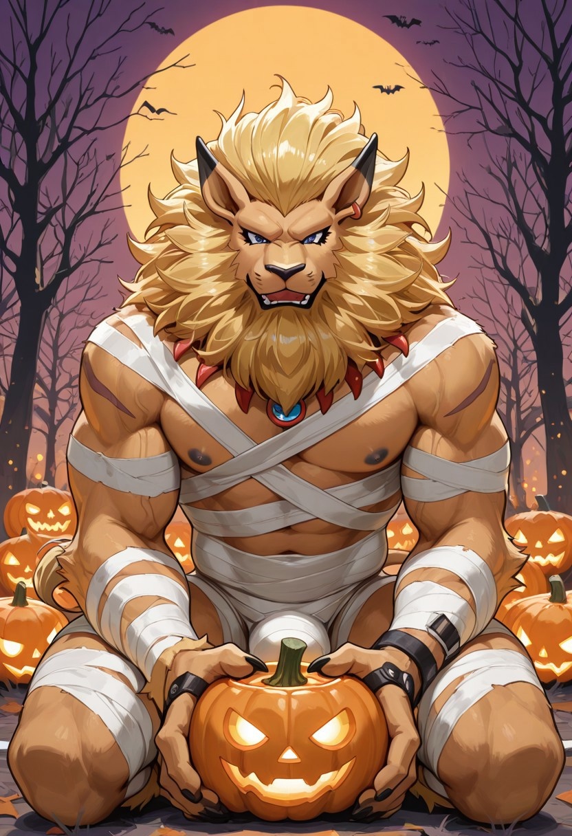 masterpiece, best quality, Leomon, male, halloween theme, jack-o-lantern, solo, mummy costume