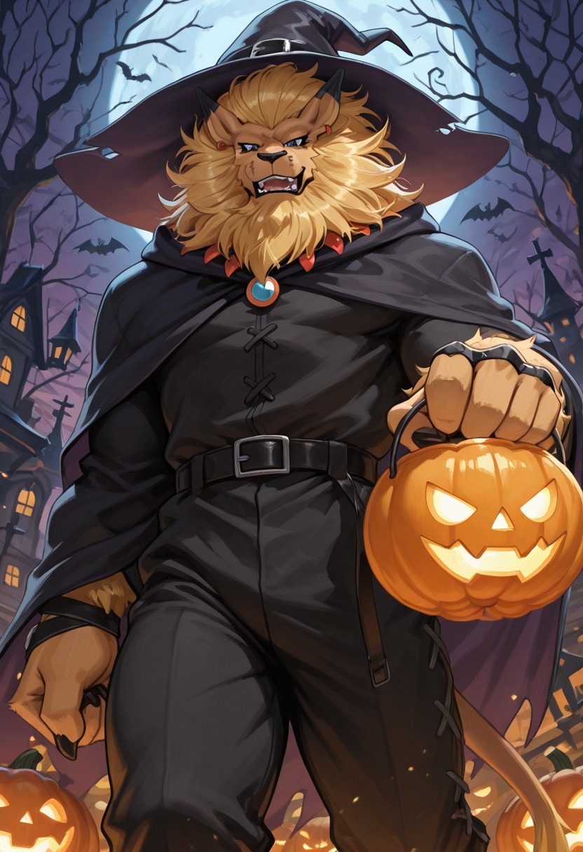 masterpiece, best quality, Leomon, male, halloween theme, jack-o-lantern, solo, witch costume