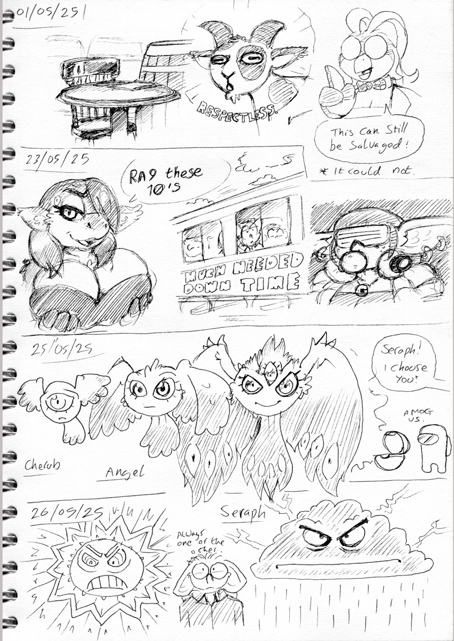Paper sketches from May. Goats are respectless. Kathy the reindeer from Cyberlife, I needed a break, Cherry chewin' gum. The weather was being awkward. I was asked me to make up a pokemon. Supporters get to see my work early. https://patreon.com/DrXII & https://subscribestar.adult/drxii