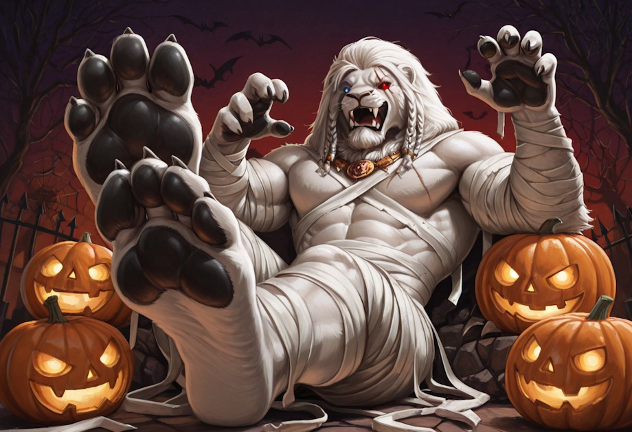 masterpiece, best quality, AGoldmane, furry male, solo, muscular, lion, white fur, white hair, braids, blue eye, glowing red eye, eye scar, fangs, male, halloween theme, jack-o-lantern, solo, mummy costume, ((huge feet)), soles, humanoid feet, paw pads