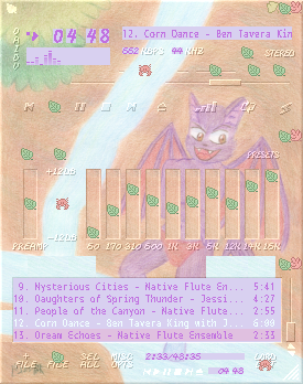 I feel this skin become very well, character and background have good balance and I like backside of this character, and I don't use many kind of colors, I use green, indigo, white, blue, purple colors, fewer colors make sophisticated mood, and I like I show multiple leaf icons on EQ sliders and volume button.