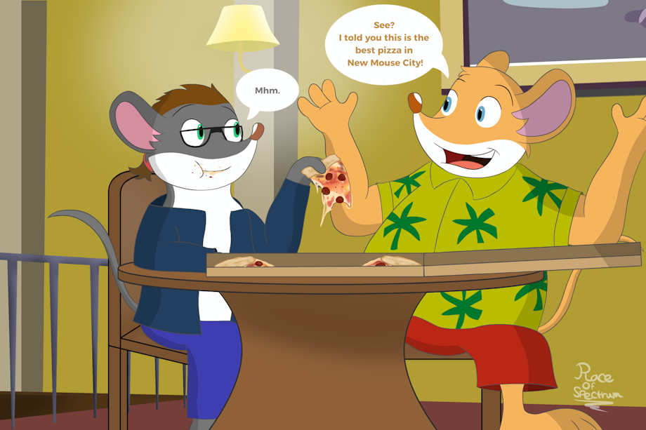 Trap invited his eternal friend and lover to the best restaurant in New Mouse City. He wanted to show him how good the food was in this city and that he could eat like a real mouse in every neighborhood. They went to Chef Ricardo's restaurant and ordered pizza from him. It tasted really good. With extra cheese and pepperoni. The cheese was flowing everywhere and Theodore reached for his first slice of pizza. IT WAS AMAZING.