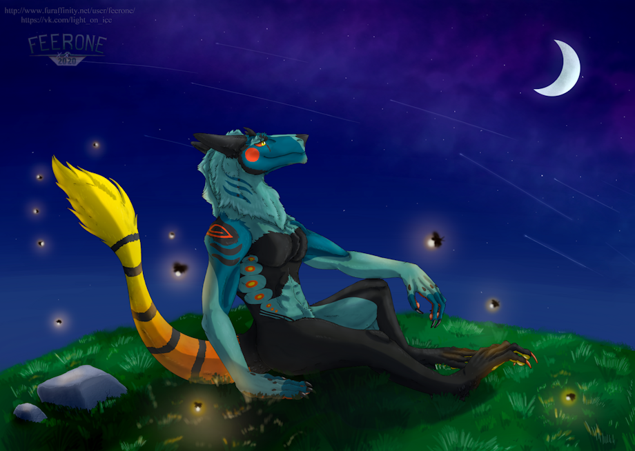 A sergal with interesting desing is sitting under the night sky, watching the Moon and starfall