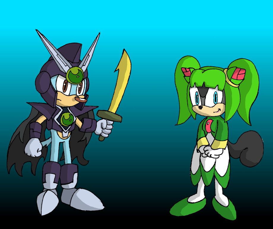 A picture I made for the crossover video with Pink Gamecube, featuring my OC Angel the Dog dressed as Dark Oak and her OC Crissy the Squirrel dressed as Cosmo