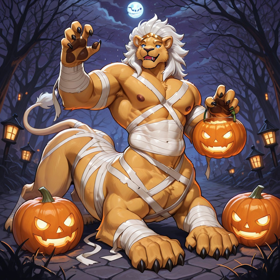 masterpiece, best quality, b4nch0, lion boy, ((male)), halloween theme, jack-o-lantern, solo, mummy costume, ((taur:1.2))