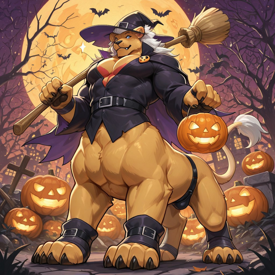 masterpiece, best quality, b4nch0, lion boy, ((male)), halloween theme, jack-o-lantern, solo, witch costume, ((taur:1.2))
