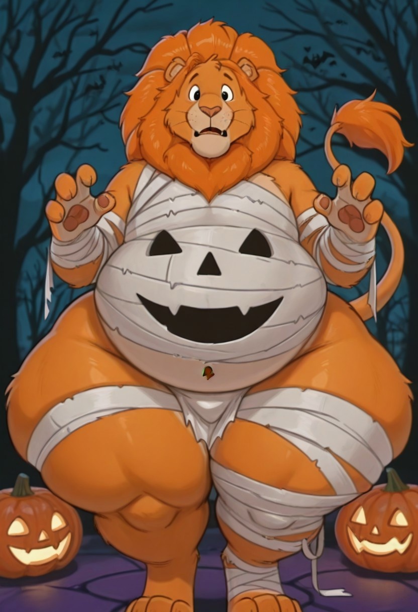 masterpiece, best quality, BraveHrtLionil, anthro, lion_boy, orange fur, orange mane, black eyes, Tummy Symbol, tail, tail tuft,, male, halloween theme, jack-o-lantern, solo, mummy costume, ((hyper thick thighs:1.5)), ((hyper wide hips:1.5))