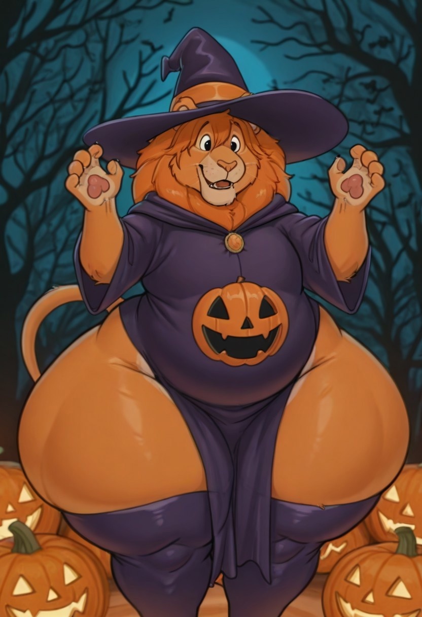 masterpiece, best quality, BraveHrtLionil, anthro, lion_boy, orange fur, orange mane, black eyes, Tummy Symbol, tail, tail tuft,, male, halloween theme, jack-o-lantern, solo, witch costume, ((hyper thick thighs:1.5)), ((hyper wide hips:1.5))