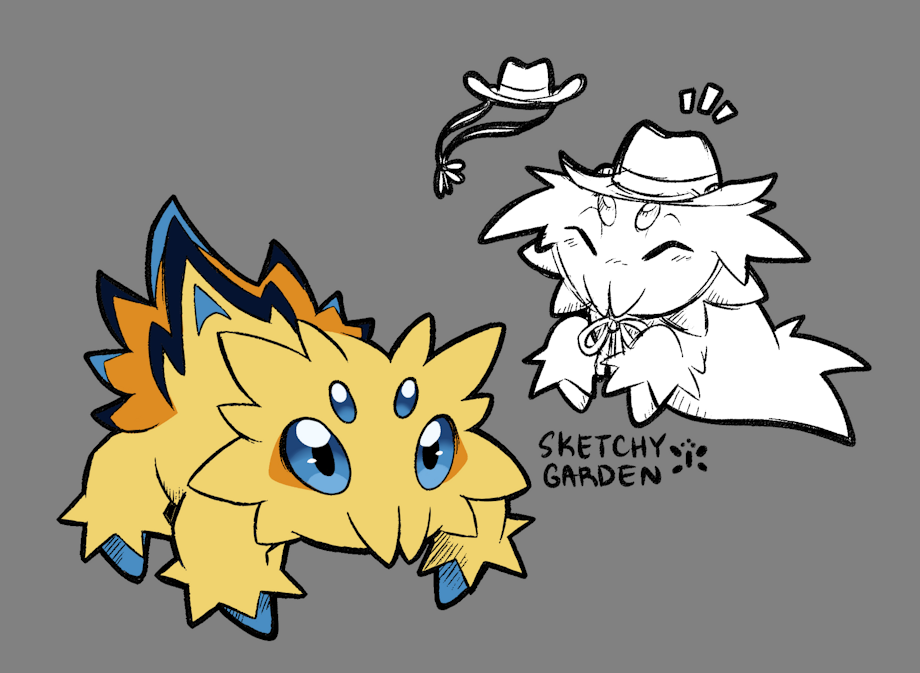 A while ago I sort of just...spawned in an OC in a discord server I'm in, which spread to a few others. I was known as 'bugb', a Joltik. For a while I was just using generic art, but after a while I wanted them to be their own thing. And thus, Spritz was born! A rootin'-tootin' cowbug with a spiffy hat and an even spiffier tail!