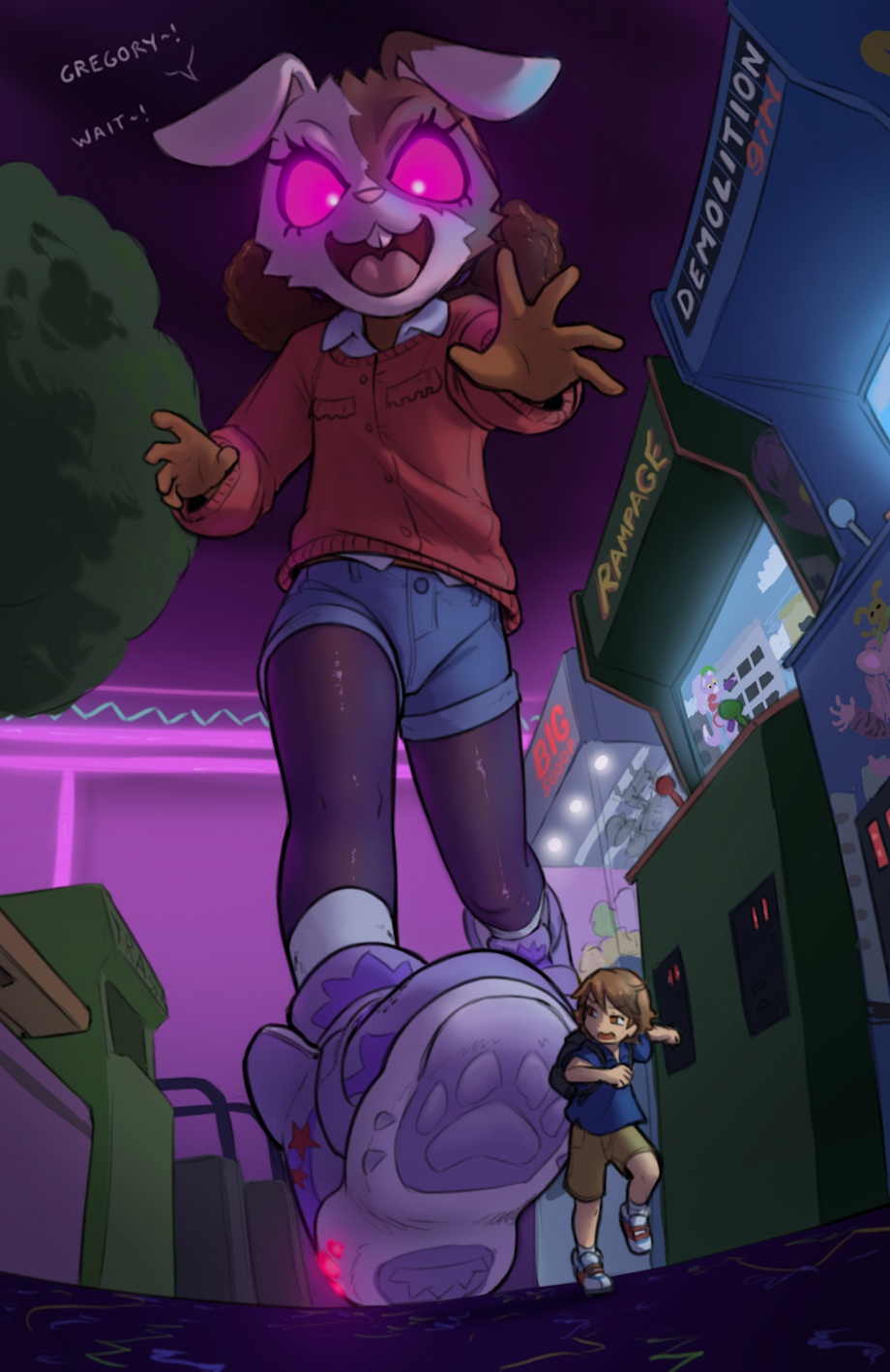 It is so awesome to see Cassie again! I really enjoyed the first time you drew her and thought she'd never appear again. There is so much detail here and I can only guess how long this took to complete, but I'm guessing it is part of why there were few uploads this time. The arcade machines are very silly with the names and screens, though "Demolition Girl" is a great easter egg~ And wow, the mask gives this picture a whole different feel. Like, Cassie looks worried, but the mask makes what she is saying come out very differently, making Gregory running a lot more fearful! This picture, and all its variations (like Cassie being huge at one point because even the arcade machines are small, but Gregory is smaller) are awesome! Bravo!