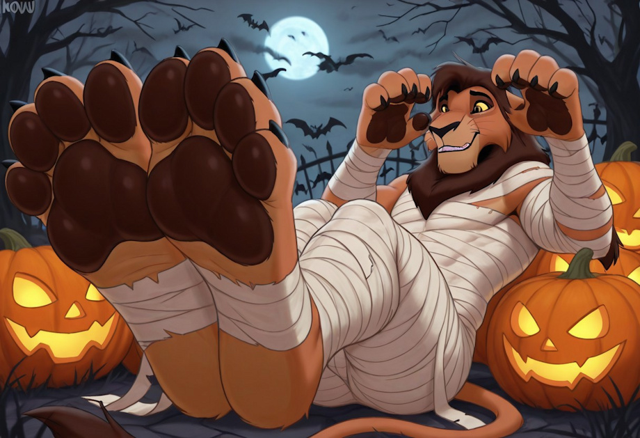 masterpiece, best quality, k0vu, lion, male, halloween theme, jack-o-lantern, solo, mummy costume, ((huge feet)), humanoid feet, soles, paw pads