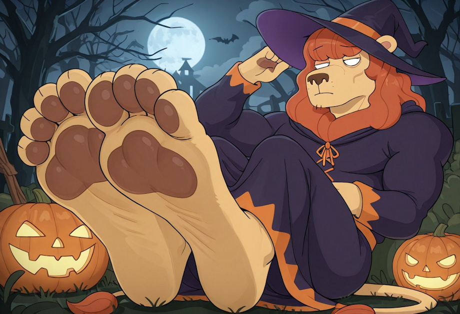 masterpiece, best quality, long hair, lion, kylelyonkff, muscular, long orange mane, black eyes. tawny fur, male, halloween theme, jack-o-lantern, solo, witch costume, ((huge feet)), humanoid feet, soles, paw pads