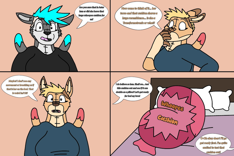 Part 12: Adrian walks into the bedroom around 10 minutes later and spots the big whoopee cushion on her and Hilde's bed. She is shocked by what she sees but then calls Hilde over which the same thing happens when the plushie wolf enters the room. Hilde doesn't know if the whoopee cushion is Aster or is just a big whoopee cushion pillow that she left behind as a gift. Hilde is right the first time. That IS Aster in disguise!