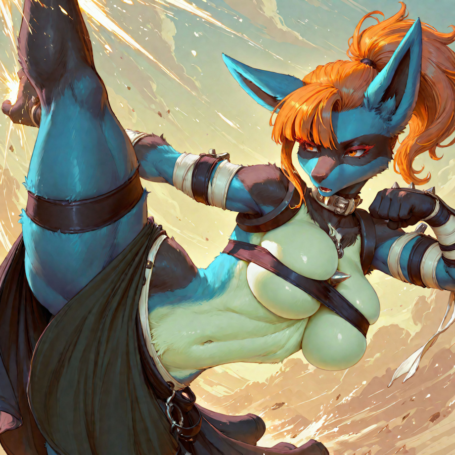 <lora:character_Sheet_XL:0.8> character sheet, Multiple views, simple background masterpiece, high quality, detailed fur, high detail, 4k, detailed background (solo, full body:1.4) (backless shirt, jeans:1.4) <lora:(1) FenrisXL Lighting:1> <lora:(1) Mjölnir (SDXL Lighting):1> <lora:photorealistic anthro 2:1> furry <m335h4> (female:anthro:growlithe:1.5), (floppy ears, orange fur, white belly:1.7), (blue eyes:1.4), (short girl, curvy:1.5), (slim waist, athletic:1.4), (light brown hair:1.7), (pixie cut, long ponytail:1.7), (wide hips:1.3), (big breasts:1.4), (studded collar:1.4), (thick wrists:1.4), (striped fur, black stripes on hips:1.5) Negative prompt: bloodshot eyes, arms behind back, hands behind back, blurry, blurry background, bad anatomy, bad hands, three hands, three legs, bad arms, missing legs, missing arms, poorly drawn face, bad face, fused face, cloned face, worst face, three crus, extra crus, fused crus, worst feet, three feet, fused feet, fused thigh, three thigh, fused thigh, extra thigh, worst thigh, missing fingers, extra fingers, ugly fingers, long fingers, horn, realistic photo, extra eyes, huge eyes, 2girl, amputation, disconnected limbs, worst quality, normal quality, low quality, low res, blurry, text, watermark, logo, banner, extra digits, cropped, jpeg artifacts, signature, username, error, sketch ,duplicate, ugly, monochrome, horror, geometry, mutation, disgusting, jpeg artifacts, , NEGATIVE_HANDS ac_neg2 p0rnXL-neg DeepNegative_xl_v1 BeyondV3-neg Steps: 30, Sampler: DPM++ 2M SDE, Schedule type: Karras, CFG scale: 5, Seed: 762420473, Size: 768x1152, Model hash: 171e88f0da, Model: yiffymix_v62Noobxl, Denoising strength: 0.51, Mask blur: 4, Lora hashes: "character_Sheet_XL: 4c59246e5115, (1) FenrisXL Lighting: c49df8024095, (1) Mjölnir (SDXL Lighting): 368d428918ac, photorealistic anthro 2: bed53d4c8b68", TI: "NEGATIVE_HANDS, ac_neg2, p0rnXL-neg, DeepNegative_xl_v1, NEGATIVE_HANDS, ac_neg2, p0rnXL-neg, DeepNegative_xl_v1", Version: f2.0.1v1.10.1-previous-224-g90019688 |