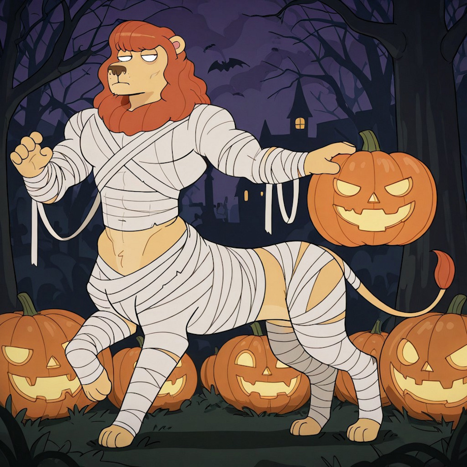 masterpiece, best quality, long hair, lion, kylelyonkff, muscular, long orange mane, black eyes. tawny fur, male, halloween theme, jack-o-lantern, solo, mummy costume, ((taur:1.2))