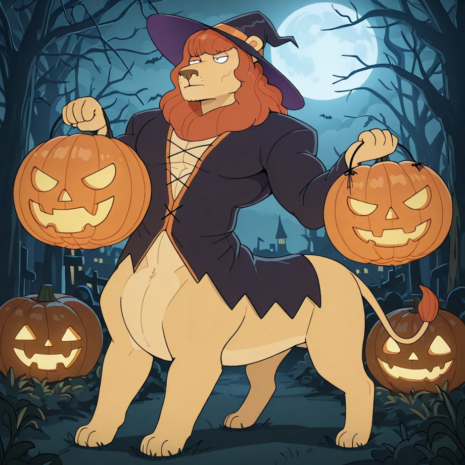 masterpiece, best quality, long hair, lion, kylelyonkff, muscular, long orange mane, black eyes. tawny fur, male, halloween theme, jack-o-lantern, solo, witch costume, ((taur:1.2))