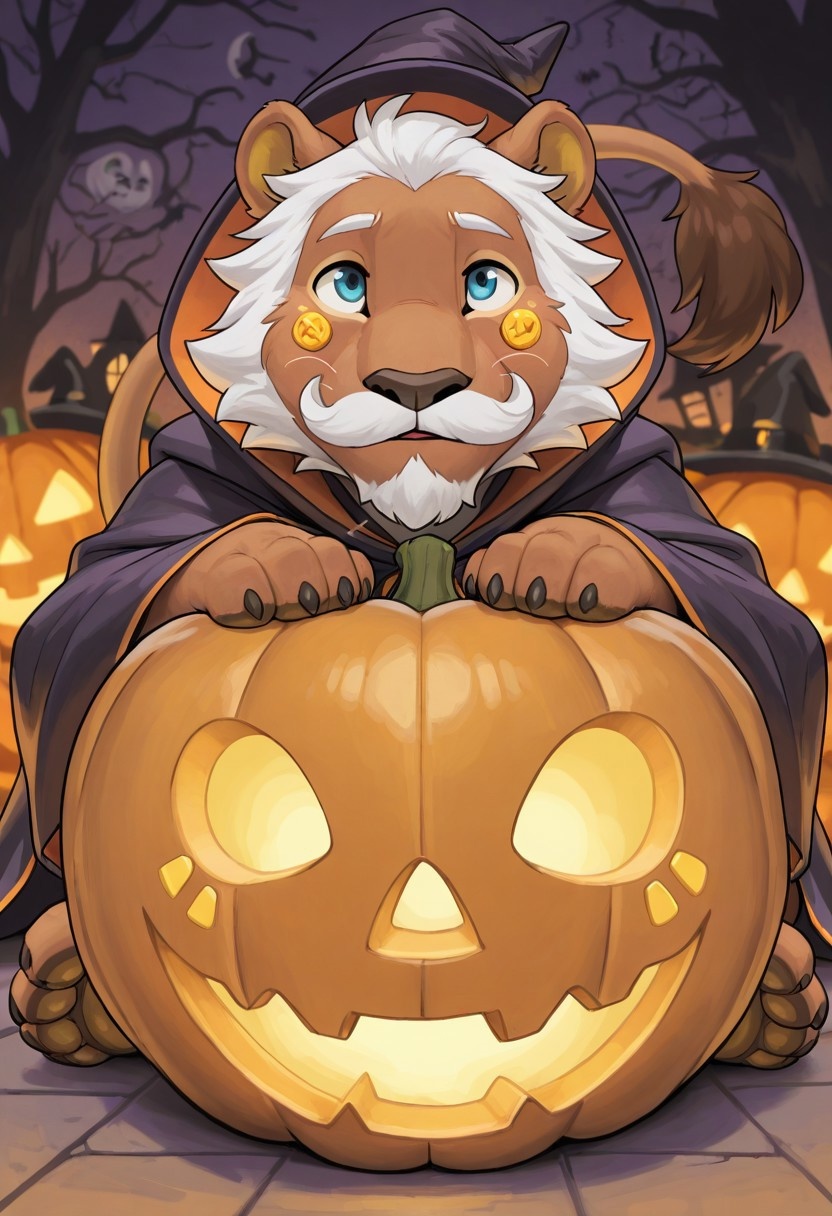 masterpiece, best quality, Leopold-AC, Lion, brown fur, white fur around head, white facial hair, white mustache, lion ears with yellow inside, cheeks, blue eyes, Brown skin with dark brown tips, Lion tails with brown fur on tips, barefoot, yellow digital pads, ((male)), halloween theme, jack-o-lantern, solo, witch costume