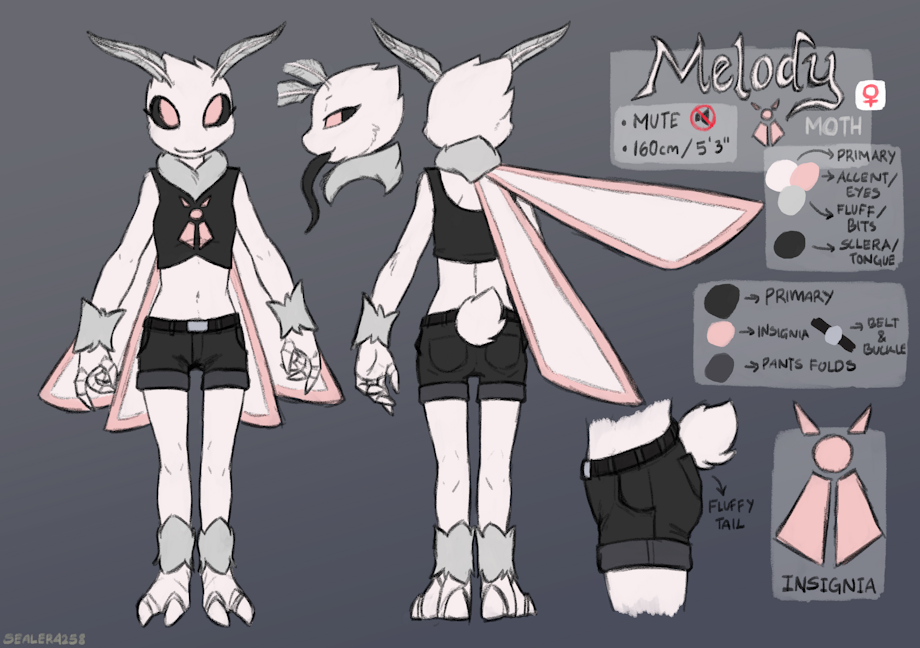Melody the Moth is a mute Moth girl. She plays the lead guitar in a band so her melody leads the song, giving her the voice that she lacks. She is a little playful and mainly cheery and bubbly.