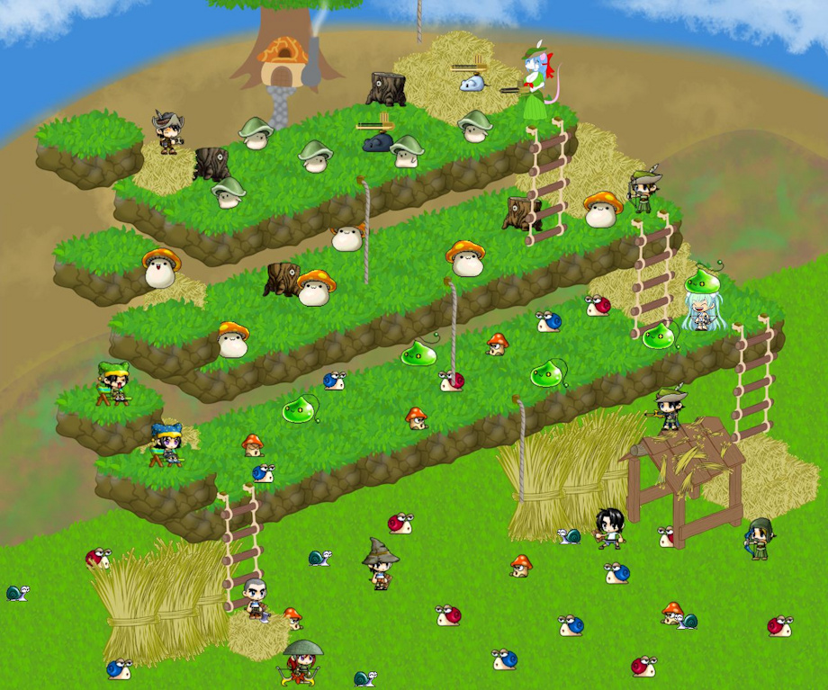 To explain in short what we see here, is what is known as Henesys Hunting Grounds of the Elvan township Henesys. It's a three tier platform with progressively more difficult monsters to hunt, each giving better experience and coin drops, and the utter chaos of this map is somewhat evident here, even if the canonical layout of this map is a 2D side-scroll platform jumper.