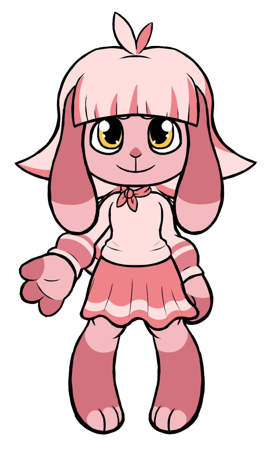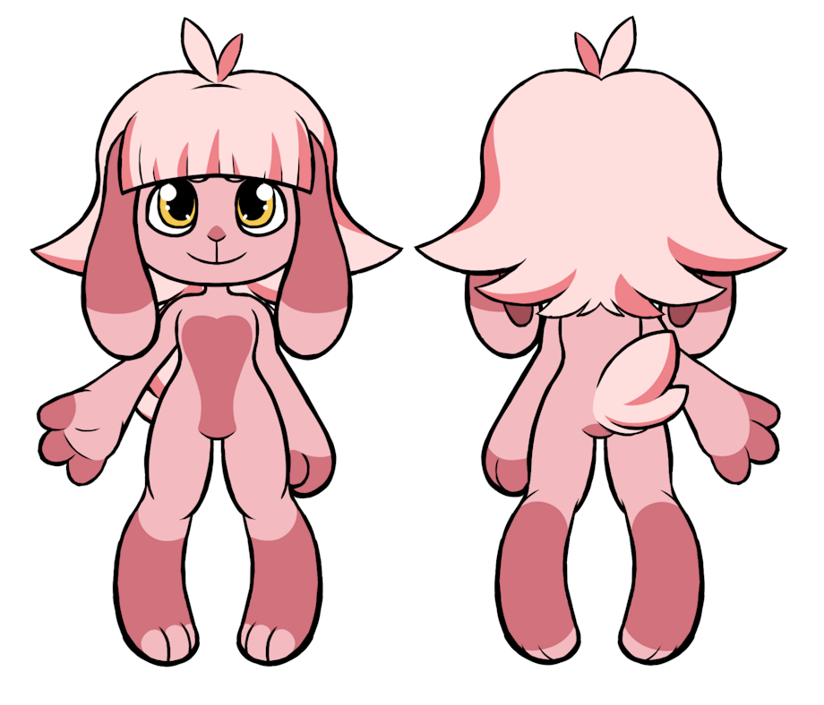Lop-eared; pink fur with a pattern of darker pink; light pink hair with pink streaks, straight bangs, and split cowlick; bright yellow eyes, large gap between front teeth; long, slender legs