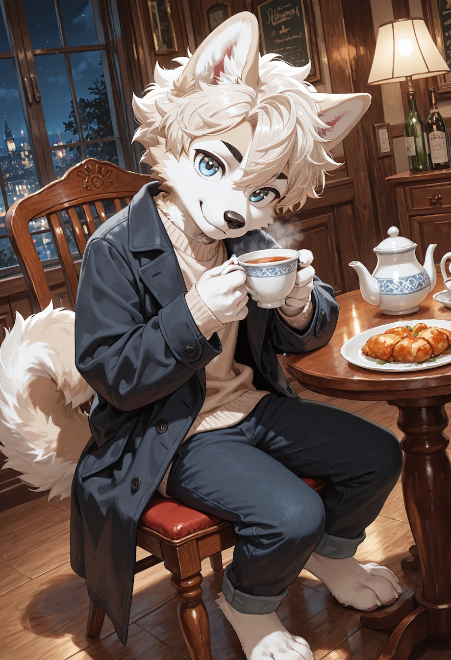 You are scanning the area, looking for a free place, which unfortunately didn't happened. Devastated, you want to turn back to the front door, but then, for a split second, you see someone sitting at the very back of the cafe, staring straight at you, meanwhile melting its lips into a cup of warm drink. Curious taking over you and with slow twist, you are directing yourself at him. As both of you making eyes contact, he withdrew the cup from his muzzle, showing his young face, as beautiful as the view from the top of the mountains, equipped with a smile warm as a fireplace.