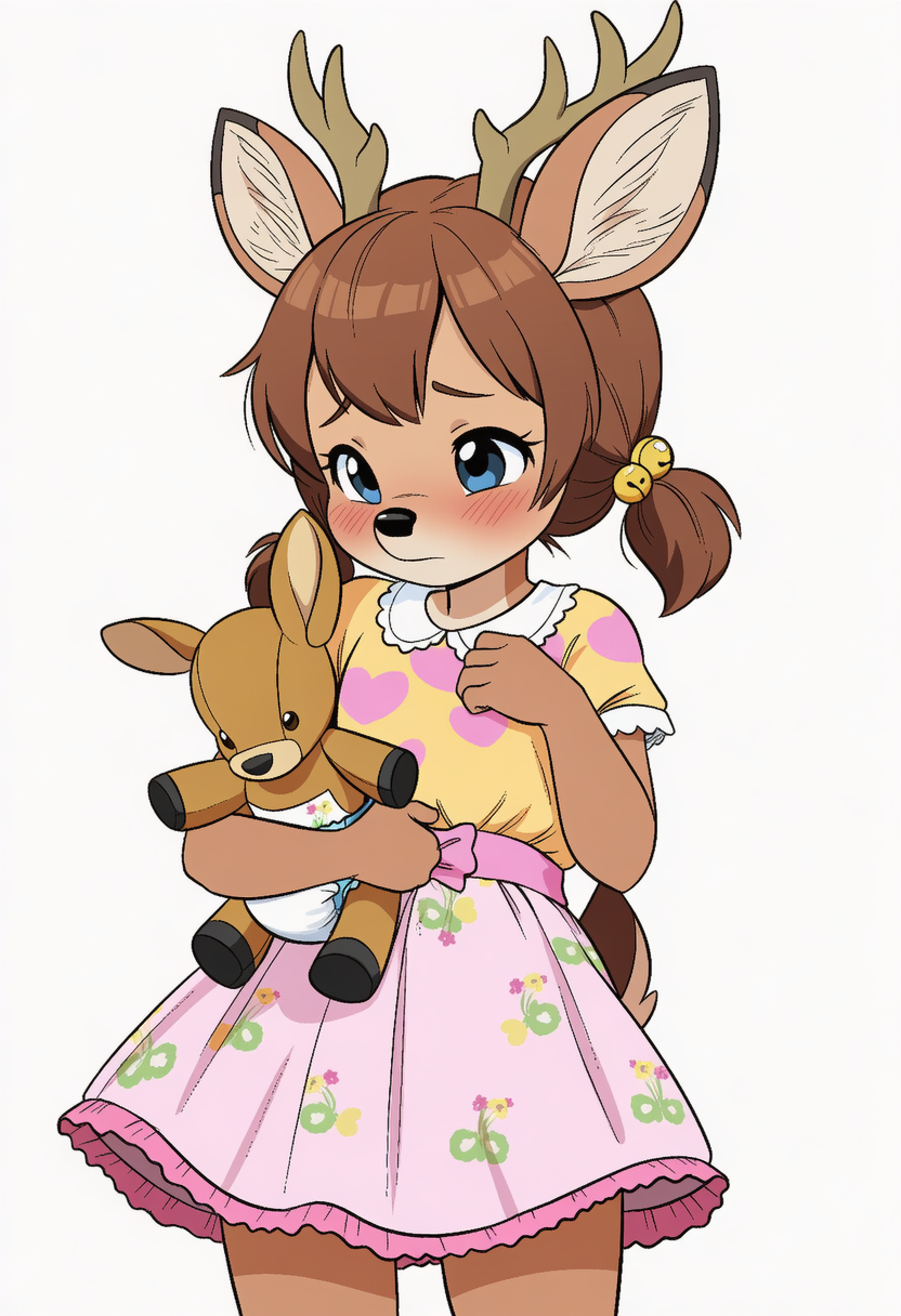 Prompt: Deer girl cub furry, anthro, big diaper manga, plushie, anime cute fullbody kid small short, medium hair shy fyrry