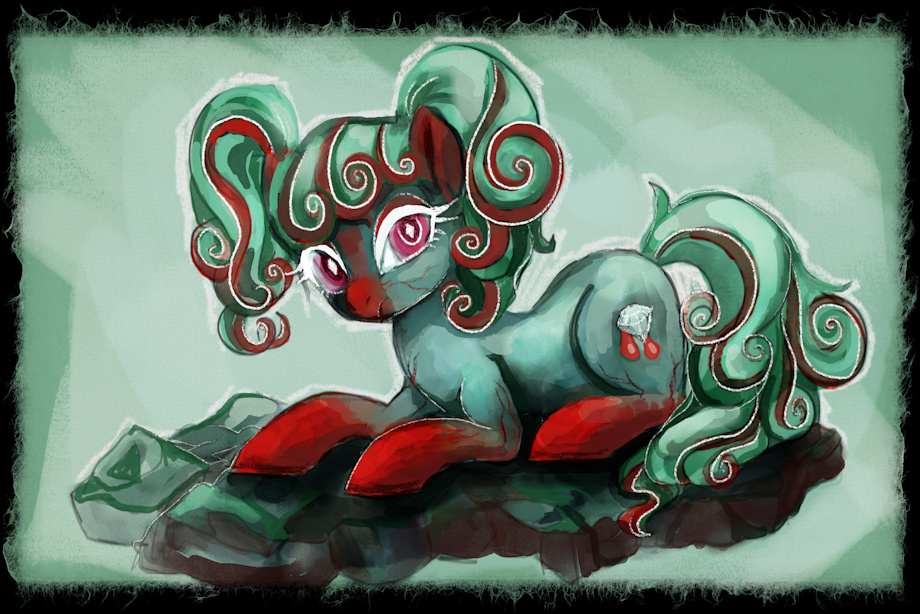 On one hoof she's freakin' beautiful despite her look of trepidation. On the other hoof I'm in awe of the stark, bloody theme of her bloody-themed colors and cutie mark, plus the severity of the veins. Such a gorgeous form with all that perky roundness and pretty white curls (like MLP clouds), yet so damaged and dangerous. Even the floating rock she's on says precarity. And her intense stare and frown are a stronger warning than anything else. Beautifully evocative and just plain beautiful.
